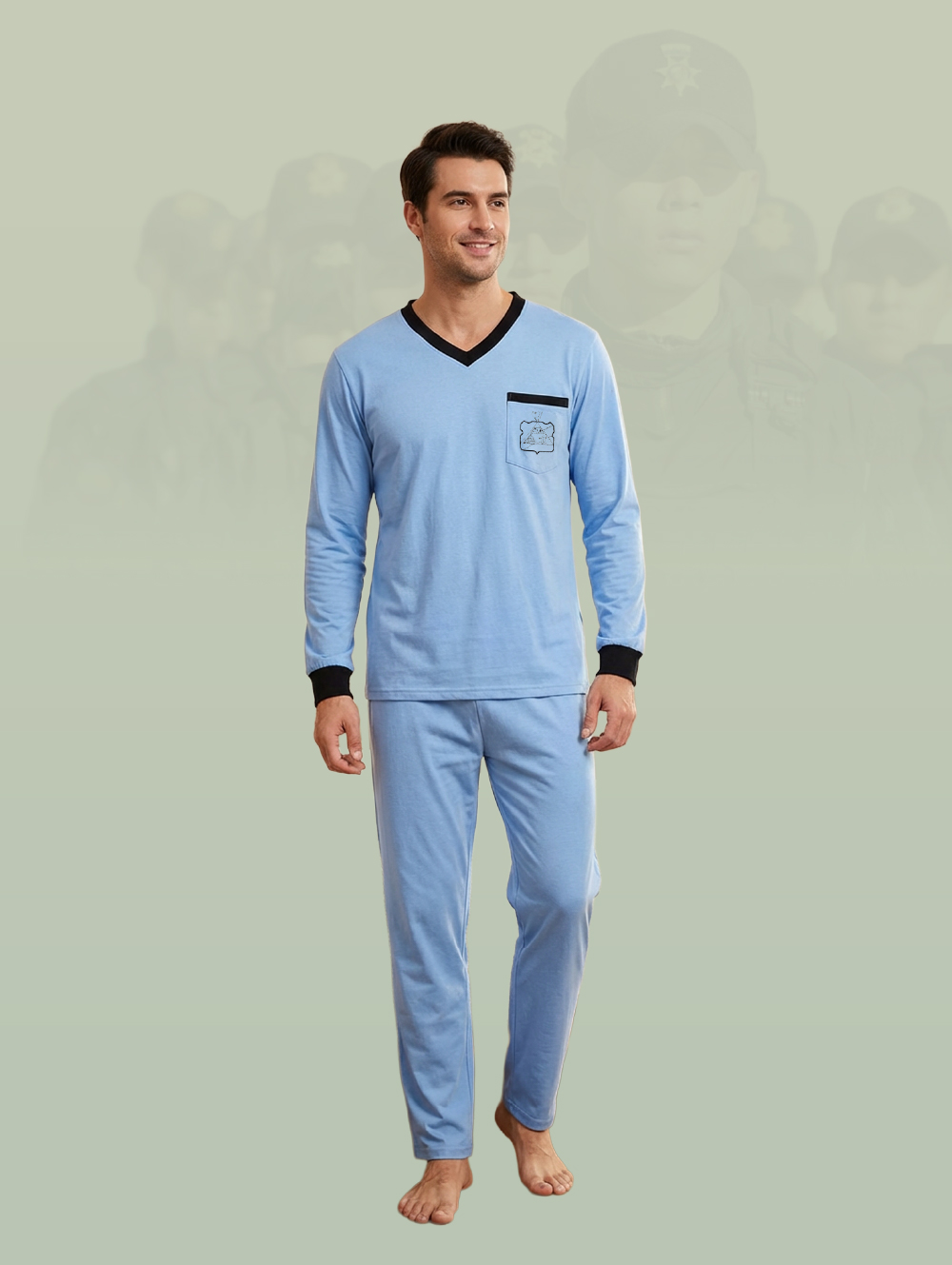 Se compone de un pijama en color celeste de dos piezas 65% poliéster y 35 % algodón. BUZO (Cuello en V manga larga con ribeteado azul marino en el cuello, puños y parte superior del bolsillo), PANTALÓN (Recto, en la parte de la cintura lleva elástico)